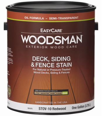 STOV10, Easycare Woodsman, Gallon, Redwood, Semi-Transparent Oil Deck & Siding Stain, VOC Compliant In OTC & Carb, Replaces Linseed Il With Acrylic Core Shell Oil Alkyd Technology, Improved Dry Time Over A Variety Of Substrates, Much Improved Exterior Durability, Improved Chalk Resistance, Improved Early Water Resistance, Uses Advanced Transparent Oxide Technology, Excellent Water Hold Out, Higher Solids Formulations, Use On All Exterior Wood Trim, Siding & Decking Dependent On The Product Selected, VOC Than 250 Grams Per Litre.